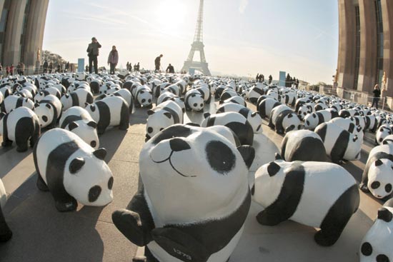 Le WWF, qui fête ses 35 ans, veille sur sa mascotte : il?ne resterait plus que 1 600 pandas sur terre, menacés par l’aveugle saccage écologique en cours. Une cause colportée de place en parvis par une aimable petite bande de sosies en papier mâché (ici, au Trocadéro à Paris). Les pandas, et les autres… La Terre vit une disparition des espèces cent à mille fois plus rapide qu’au cours d’aucune autre extinction.