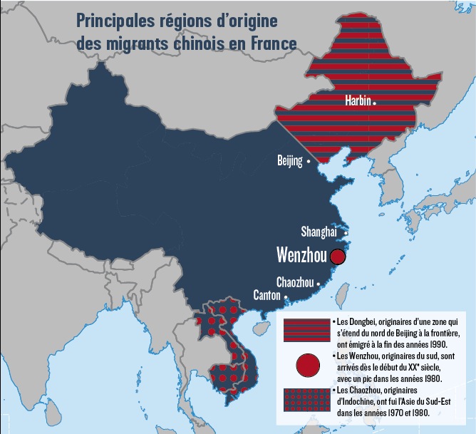 Décembre 2012. L’Association des jeunes Chinois de France (AJCF), avec SOS Racisme, assigne le Point en justice pour insulte raciale. En cause, un dossier jugé « insultant » par les clichés véhiculés. C’est la première fois que des Français d’origine chinoise portent plainte contre un média. Selon Rui Wang, porte-parole de l’AJCF, les Chinois, longtemps perçus comme des immigrés modèles, souffrent aujourd’hui de la crainte qu’inspire leur pays sur la scène internationale. À Paris, certains quartiers, petits « chinatowns », cristallisent les fantasmes. Dès les années 1960 et l’arrivée de Chinois dans le XIIIe arrondissement, un sentiment d’invasion se développe. Un sentiment raillé par Georges Lautner et Michel Audiard dans les Barbouzes, sorti en 1964. On y voit Lino Ventura, Francis Blanche et Bernard Blier tentant de résister à un complot asiatique. Férus de technique moderne, entre oreillettes, caméras et systèmes d’enregistrement, les « Chinois » sont évidemment petits et vêtus de kimonos, mais surtout ils sont toujours plus nombreux. Les trois héros n’arrivent pas à venir à bout des assauts de ces hommes qui se multiplient et semblent affluer à la vitesse de 24 images par seconde, comme au cinéma… Les décennies et les migrants se succèdent, mais l’idée demeure. Estimée à quelque 600 000 âmes aujourd’hui, la population chinoise de France est pourtant loin d’être homogène. On y distingue essentiellement trois origines, auxquelles viennent s’ajouter d’autres, minoritaires. Entre les Chaozhou, Chinois d’Indochine, les Wenzhou, paysans du Sud, et les Dongbei, citadins du Nord, un monde existe, tant le parcours migratoire et l’intégration dans la société française diffèrent. Les Chaozhou tiennent leur nom d’une ville du sud que la plupart d’entre eux n’ont jamais connue. Chinois de la diaspora en Indochine, ils étaient majoritairement urbains, commerçants et intellectuels. Dans les années 1970-1980, ils fuient l’arrivée au pouvoir des communistes en Asie du Sud-Est. Ils partent pour Paris, où la plupart d’entre eux obtiennent le statut de réfugiés puis la nationalité française. Leur intégration dans la société est plus aisée que pour d’autres, tant par leur situation légale que par une langue et une culture françaises qu’ils connaissent déjà. Ceux dont les diplômes ne sont pas reconnus se lancent dans le commerce, à l’instar des frères Tang, propriétaires de la chaîne de supermarchés du même nom. Disséminés dans la société française, nombre d’entre eux ont aujourd’hui quitté la capitale pour la banlieue et le commerce pour d’autres professions.
