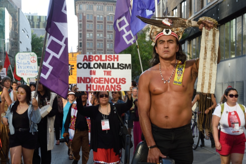 Toutes les grandes centrales syndicales québécoises sont présentes, aux côtés de groupes très variés — environnementalistes, féministes, groupes de solidarité internationale, défenseurs d’une juste retraite, de l’éducation pour tous et des services publics, paysans de la Via Campesina, groupes altermondialistes de la première heure, aide aux migrants, mouvement pour la paix, soutiens à la cause palestinienne, défenseurs des acquis sociaux du Venezuela de Chávez, membres de mouvements sociaux anti-Temer, qui a pris le pouvoir au Brésil sur un coup d’État parlementaire. Et des représentants des Nations premières, peuples autochtones du Pérou, du Mexique, des États-Unis et bien sûr du Canada, en tête de la manifestation, qui a réuni entre plus 12 000 et 15 000 participants.
