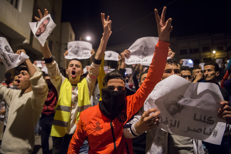 N ous sommes tous Zefzafi », s’écriaient des milliers de manifestants la nuit dernière à Al Hoceïma. Vers 22 heures, après la rupture du jeûne du ramadan, les habitants ont afflué dans les principales artères de cette ville du Rif, afin de réclamer pour la deuxième nuit consécutive la libération du leader de la contestation populaire dans le Nord du Maroc, Nasser Zefzafi. Interpellé lundi matin, il était activement recherché par la police depuis vendredi soir pour avoir « insulté le prédicateur et prononcé un discours provocateur ». L’homme de 39 ans avait interrompu le prêche d’un imam de la mosquée Mohammed VI en haranguant: « Est-ce que les mosquées sont faites pour Dieu ou le makhzen [pouvoir, NDLR] ? », un geste symbolique sachant que le roi est le chef religieux du royaume.