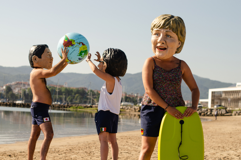 Les têtes des sept chefs d’État deviennent des pantins au service des messages à passer. Plus tôt dans la matinée, l’équipe d’Oxfam les a confortablement installés sur la plage : Donald Trump se fait bronzer, tandis que Boris Johnson construit un minuscule château de sable. Les #G7welcometoparadise, lancé sur les réseaux sociaux par des médias indépendants, prend tout son sens. Dressés fièrement au-dessus de la foule, les visages imprimés des chefs d’État narguent les manifestants. Chacun traîne ses casseroles. Un badge « Glyphosate lover » souligne le portrait d’Emmanuel Macron, un autre « Migrants go home » accuse le désormais ex-président du conseil italien Giuseppe Conte.