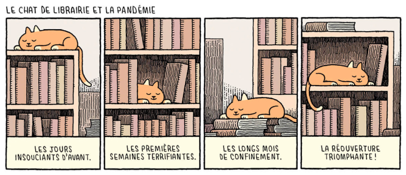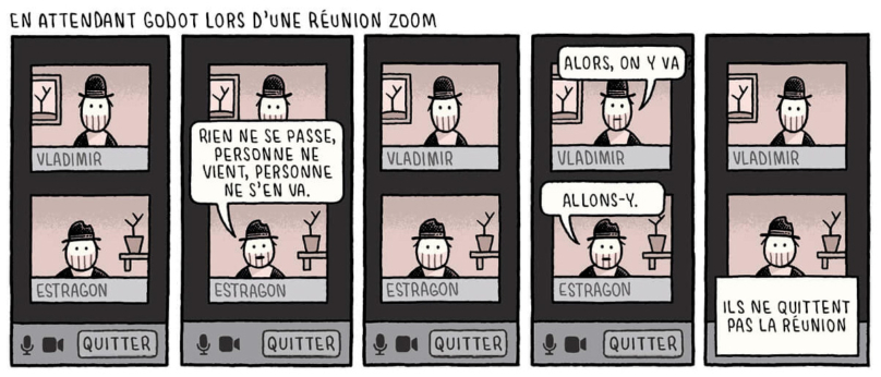 Dans La Revanche des bibliothécaires, on croise en vrac Vladimir et Estragon qui attendent éperdument Godot dans une réunion en visio (confinement oblige) ne démarrant évidemment jamais, des robots dotés d’un algorithme d’écriture qui n’écrivent rien sauf pour prévenir l’éditeur que, promis, ils auront « très bientôt » fini, une « étude des strates de la pile chancelante de livres non lus à côté de mon lit », ou encore un détective bibliophile qui demande à tous les suspects de se réunir dans la bibliothèque… juste pour se gargariser de ses éditions originales.