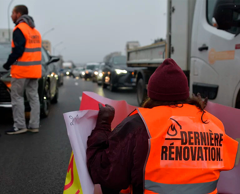 Sur le parvis du tribunal judiciaire de Créteil, des gilets orange fluo font leur apparition. Dans le dos est inscrit « Dernière rénovation ». Ce jeudi 11 mai, huit militant·es écologistes de la campagne de désobéissance civile du même nom comparaissaient pour « entrave à la circulation » et « mise en danger de la vie d’autrui ». Le 28 octobre dernier, ils avaient participé à une action de blocage de l’autoroute A6 au sud de Paris en direction de la province, pendant une quarantaine de minute… un vendredi soir de départ en vacances.
