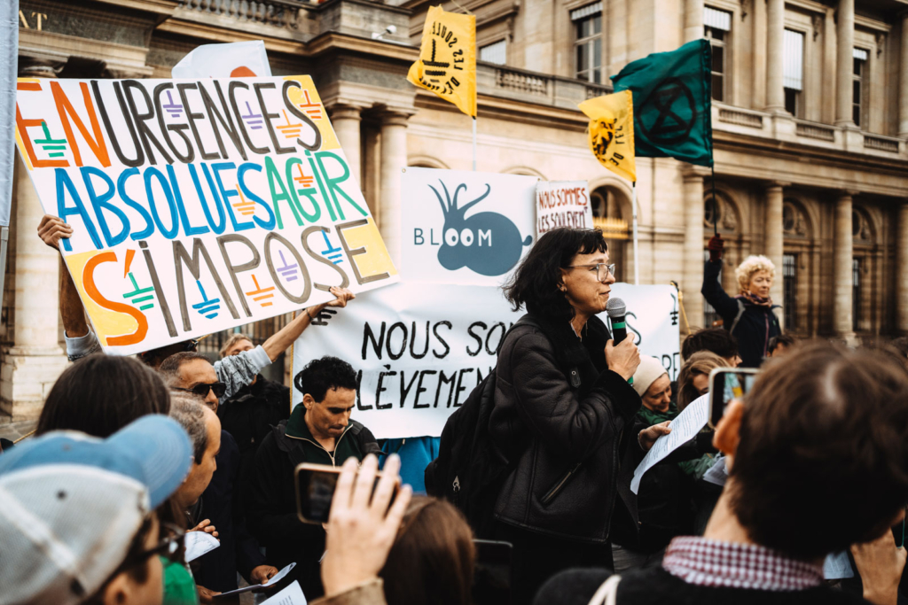 Vers 13 h 30, les prises de parole touchent à leur fin. Une fresque du Palais Royal, envahi par la végétation et cerné par une foule immense, est collée au sol. Les discussions vont bon train entre ces militants et sympathisants de tous âges, présents tant pour la défense de la planète que la défense de la gauche antifasciste. Un chœur se forme et accompagne de ses chants la fin du rassemblement : « Il faut qu’il tombe, tombe, tombe. Vois-tu, comme il penche déjà. » (1) Prémonitoire ?