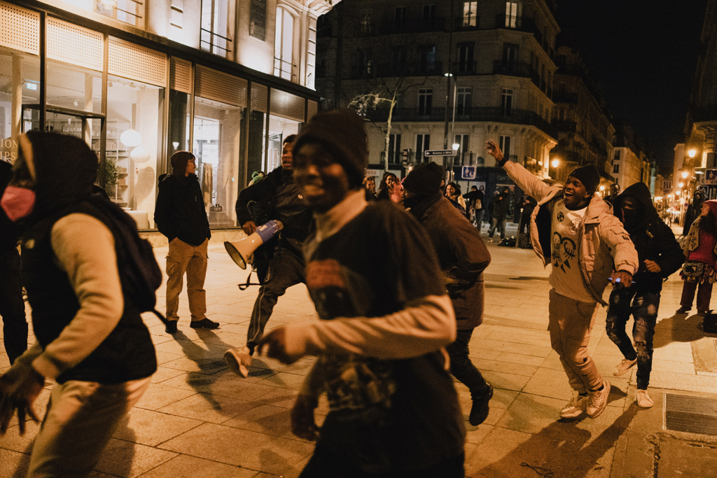 Au cours de la nuit, une partie de football s’improvise. Quand les lumières bleues des gyrophares commencent à se faire voir et que les camions de CRS, de la gendarmerie et de la compagnie d’intervention s’installent dans le quartier, les soutiens rassemblés se séparent et se placent des deux côtés de la rue Papin, afin de former un cordon pour « faire une présence entre les flics et les jeunes ». Certains jeunes restent devant l’entrée de la Gaîté lyrique, d’autres se sont déjà éloignés.