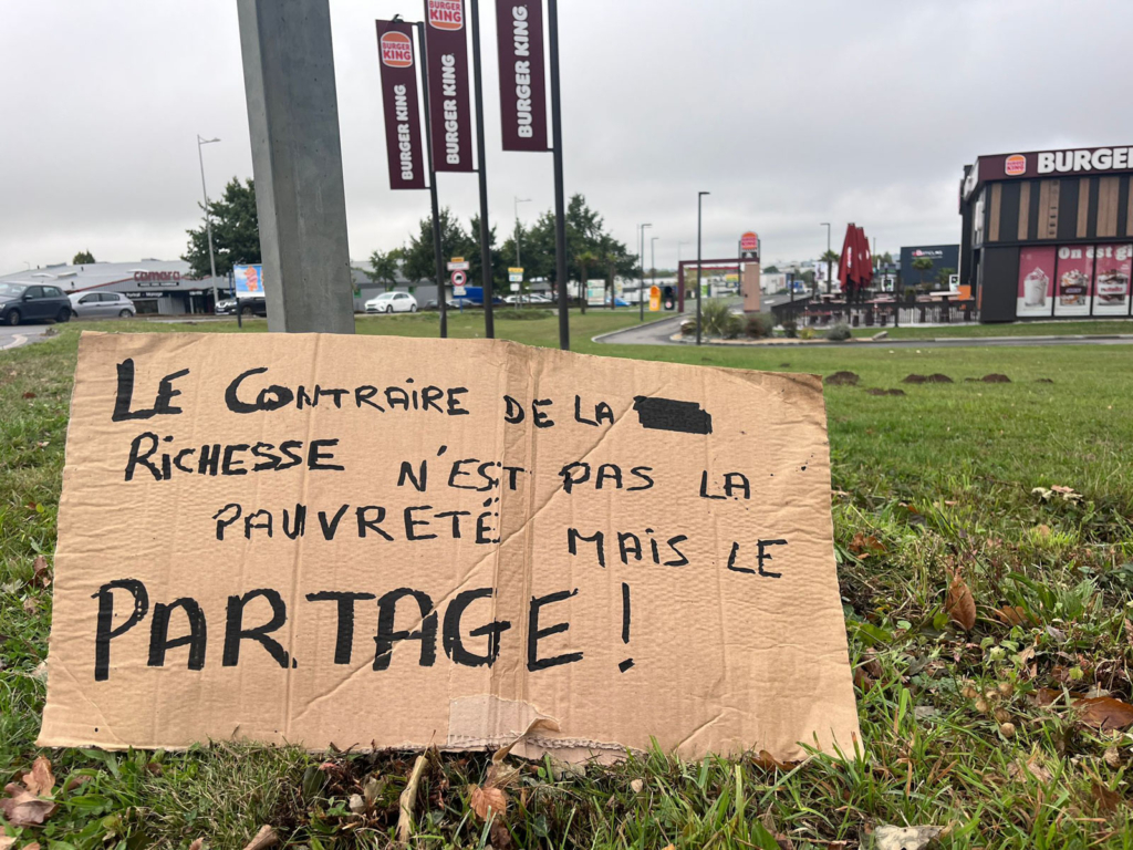 Jérôme habite Orsay. Il tient un lieu de « vie commune » dans la ville. Aujourd’hui, il est venu avec sa bicyclette des années soixante-dix pour « imiter Rémi Gaillard » et ralentir la circulation « tout en faisant rire ». Après plus d’une heure de tour de rond-point, il s’arrête, prend un sac-poubelle et ramasse les déchets. Une pancarte traîne au sol : « Start up for kids ». Il souffle : « C’est dingue quand même non ? » Cela fait plus d’une semaine qu’il fait des assemblées générales (AG) pour préparer la mobilisation. Manifester n’est pas forcément son habitude même s’il reste engagé au quotidien. Pourquoi est-il venu aujourd’hui ? « Pour évacuer Macron. Le rayer de l’histoire de France, tout simplement. »