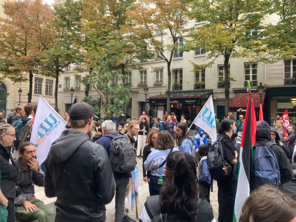 Depuis midi, nous indique notre journaliste Christophe Kantcheff, quelques centaines d’étudiants se sont réunis devant La Sorbonne pour défendre le droit à l’éducation et les services publics, dénoncer l’État policier et appeler à la grève générale et à la solidarité avec « les travailleurs du monde entier ». Le rassemblement se déroule dans une atmosphère festive, avec de la musique assurée par les étudiant.e.s. La police se tient discrète boulevard Saint-Michel.