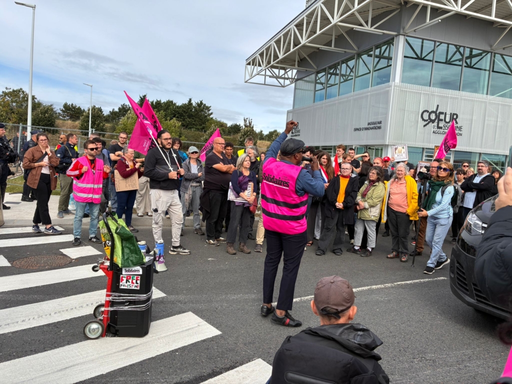 Le cortège vient tout juste d’arriver devant le piquet de grève d’Amazon. Selon les estimations de notre journaliste, Pierre Jequier-Zalc, près de 200 personnes sont venues prêter main forte au mouvement initié par les salarié·es d’Amazon, comme Rita. Elle est agente d’exploitation logistique chez Amazon depuis 6 ans. Ce 10 septembre, elle est en grève pour demander « des droits salariaux dignes ». « Elle aide beaucoup ses collègues », nous glisse l’une de ses camarades. Aujourd’hui, leur mouvement à deux cibles : « notre direction avant tout, et Emmanuel Macron », explique Rita. Au sein du cortège où flottaient des drapeaux Solidaires, Révolution permanente et France insoumise, le député LFI de la circonscription, Antoine Léaument, explique les raisons de sa présence.