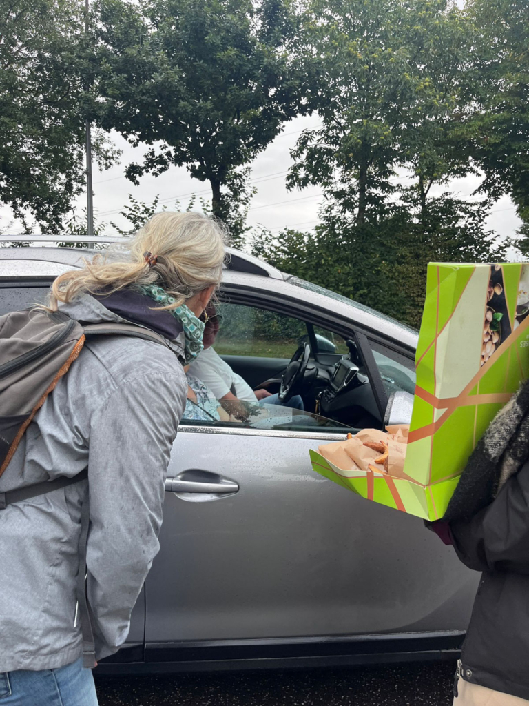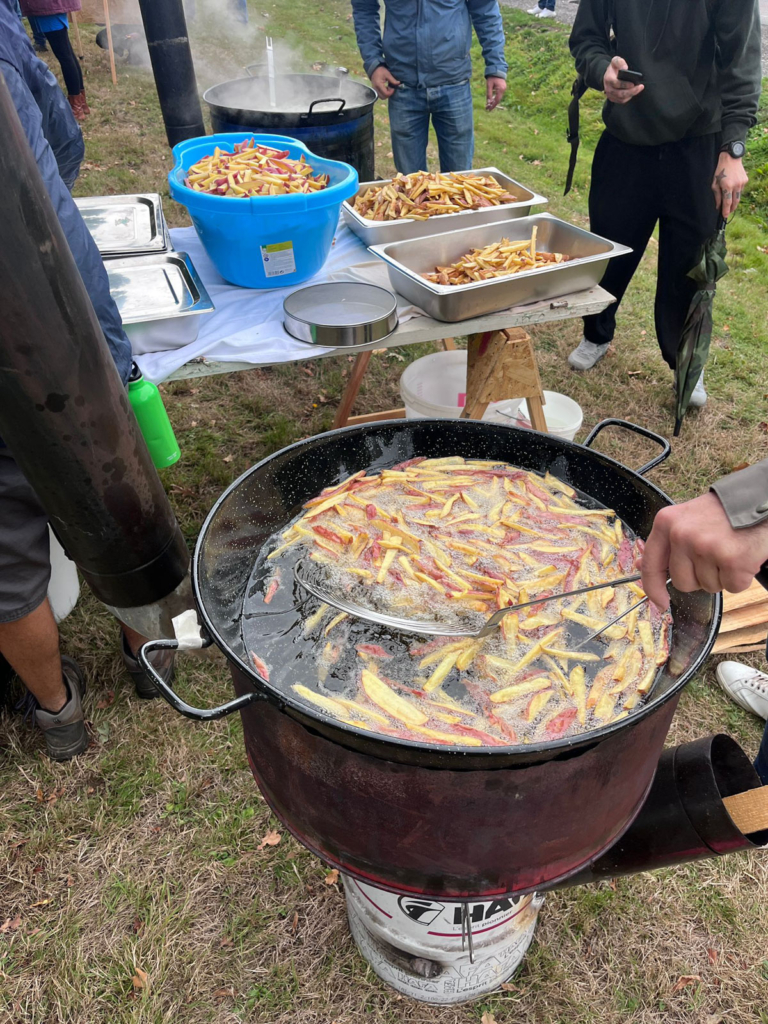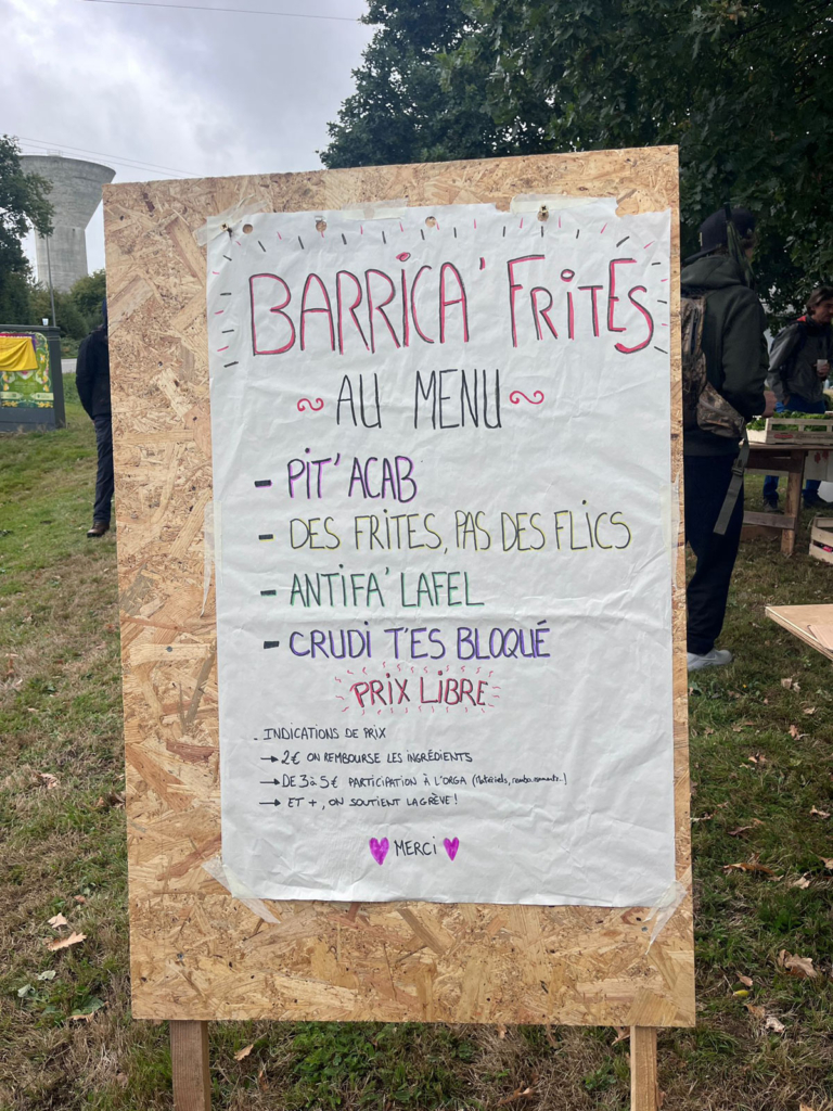 Une cantine militante, baptisée la Barrica frites s’installe au bord de la route pour nourrir la lutte : frites maison, falafel, tomates, café, thé… Une veganaise est fouettée avec une perceuse. Système D. Manon distribue des cornets de frites aux automobilistes stoppés par le barrage filtrant. Un couple d’Anglais accepte avec plaisir.