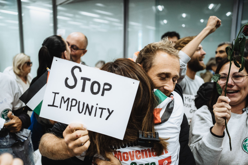 Aux alentours de 4 heures du matin, c’est le ministre d’extrême droite Itamar Ben-Gvir qui est venu haranguer les militant·es devant les caméras. « Une humiliation » pour Yacine Hannaf, médecin de formation et président de la délégation. Toujours à l’intérieur du terminal, il est au milieu de la foule et profite d’un moment chaleureux avec ses proches et soutiens.