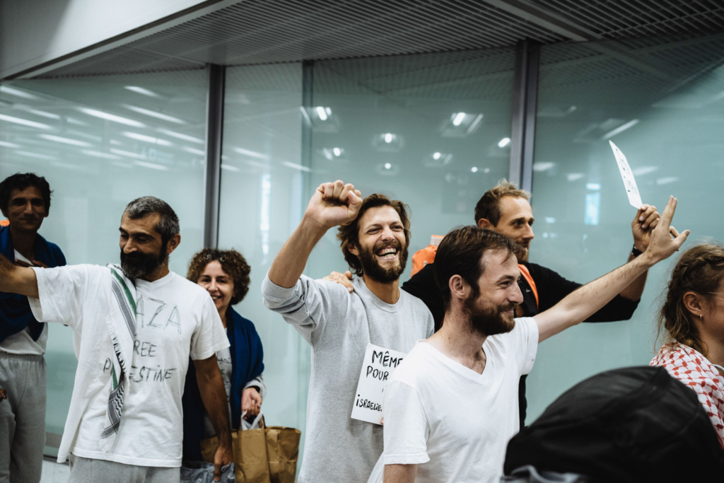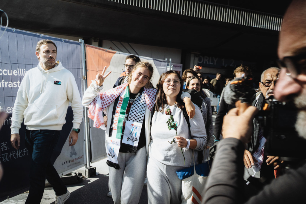Quarante minutes viennent de passer depuis l’atterrissage de l’avion, et les 28 ressortissants français, quasiment tous encore habillés d’un pull et d’un jogging gris, sortent enfin. Certains arborent « Free Palestine » griffonné au marqueur noir sur leur tenue, donnée lors de leur détention. Trois jours dans les geôles du régime de Tel-Aviv n’ont pas écorné leur motivation.