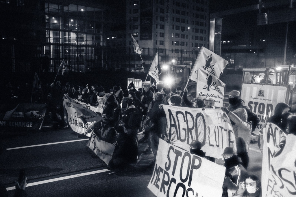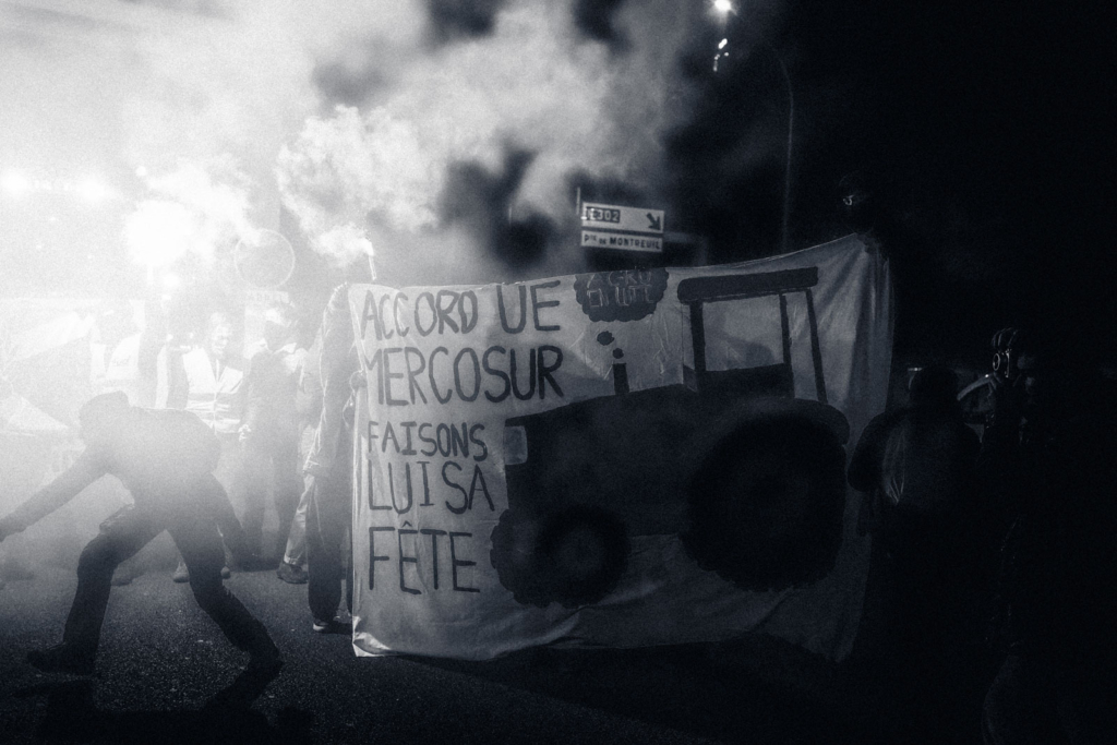 Le périphérique se mue alors en une tribune. Les militants l’occupent et se rendent visibles. Fanny Métrat, éleveuse et porte-parole de la Confédération paysanne, lie explicitement la bataille contre le traité et celle contre la politique sanitaire. « C’est la même logique : une logique de marché. » « Tout est dicté par l’économie mondialisée. Et quand Macron dit non au Mercosur, il continue de défendre ce même système. » L’accord Mercosur, dans son discours, n’est pas seulement dangereux pour les agriculteurs français, il l’est aussi pour celles et ceux de l’autre côté de l’Atlantique : « On est en lien avec les organisations paysannes, brésiliennes et sud-américaines. Elles aussi se battent contre cet accord du Mercosur. »