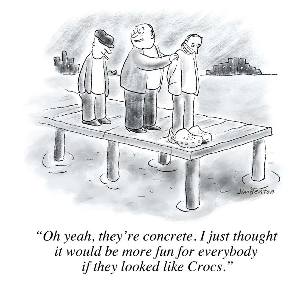 Le dessinateur, créateur entre autres de Happy Bunny – personnage de BD très connu outre Atlantique – nous offre des raisons de rire jaune (ou noir) sur ses réseaux sociaux (dont Bluesky). Comme cette vignette : « Oui, c’est du béton. J’ai pensé que ce serait plus drôle pour tout le monde si ça ressemblait à des Crocs. »