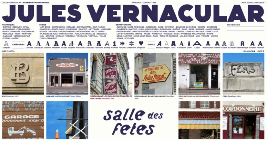 Vous passez devant sans les voir : les chiffres et les lettres des pancartes, panneaux, enseignes, peintures murales, numéros et plaques de rues, etc. qui ponctuent nos paysages urbains ou citadins. Le plasticien et dessinateur de caractères Jack Usine leur consacre cet « herbier typographique » fascinant. Une invitation à ouvrir les yeux. (Dans la même idée, voir aussi le travail de Pixdar, alias Éric Darvoy.)