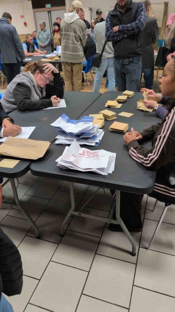 Devant le bureau de vote, un homme fume son cigare. Il est venu de Lens où le maire socialiste l’a remporté de justesse la semaine dernière face au RN. « Je comprends pas comment ce mec, qui n’est pas du coin, peut avoir autant de voix » soupire-t-il au sujet de Yanis Gaudillat, originaire de Bourgogne-Franche-Comté. Il observe « les hommes en cravate » qui entrent dans le bureau de vote où commence le dépouillement, à l’affût de parlementaires RN dont il craint qu’ils viennent pour l’annonce des résultats. Les cloches de l’église sonnent. À l’intérieur, les enveloppes sépia ont été étalées sur les tables. Autour des « dépouilleurs », une soixantaine de citoyens sont debout et observent. Billy Montigny est peut être en train de vivre ses dernières heures communistes.