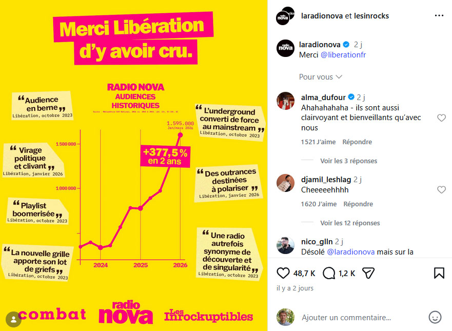 Nulle part ailleurs que dans Libération ce virage n’était plus palpable. En octobre 2023, le quotidien racontait une Nova en détresse musicale après un plan de licenciements et un nouveau directeur chargé de faire remonter les audiences, quitte à abandonner un peu de la singularité de la station dans le paysage radiophonique. Le titre ? « La nouvelle grille apporte son lot de griefs. » Un peu plus de deux ans après, même journal, même journaliste, autre ton. « Une renaissance sous le signe d’un renouveau transgressif », titre Libé en janvier 2026. Si l’article critique toujours la playlist, il flatte le choix de l’humour sans limite et le succès des émissions.