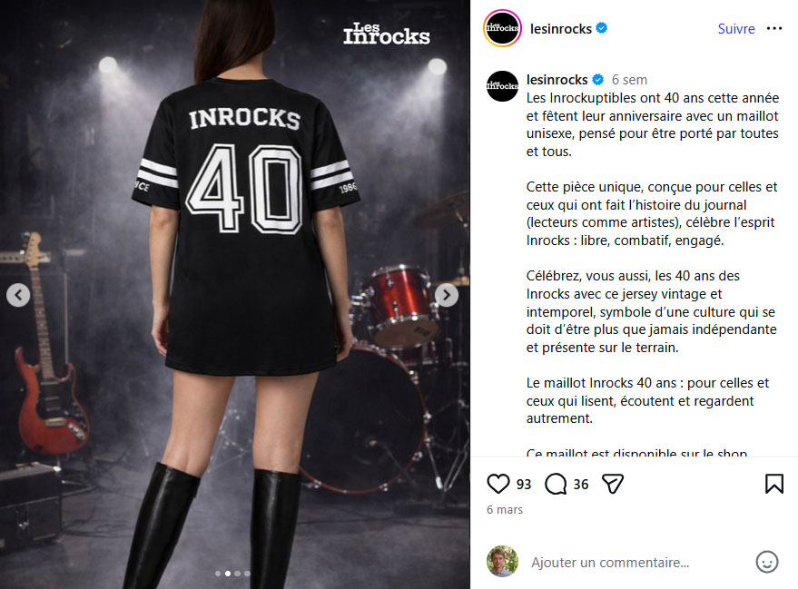 Outre son management « jugé brutal », Libé assure qu’elle est à l’origine d’une publicité sexiste de fort mauvais goût et réalisée par l’IA pour ne rien gâcher. En l’occurrence, un post Instagram diffusé en mars afin de vendre un maillot de football américain au nom des Inrocks, porté par une femme sans pantalon, pour célébrer le 40e anniversaire du magazine.